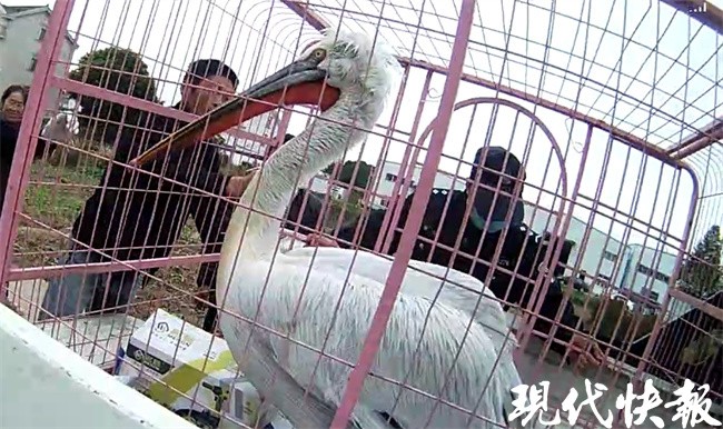 随后,民警对这只鹈鹕进行了初步检查,发现其并无外伤。为防止其再次飞走,民警将鹈鹕移至笼子内带至派出所,并第一时间联系了野生动物保护部门。目前该鹈鹕已移交至虞山动物园暂时代养。