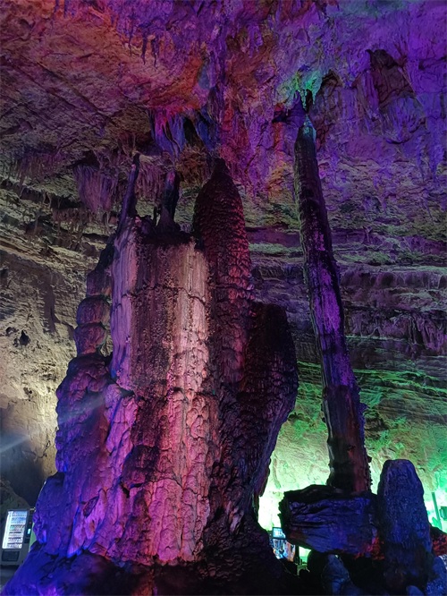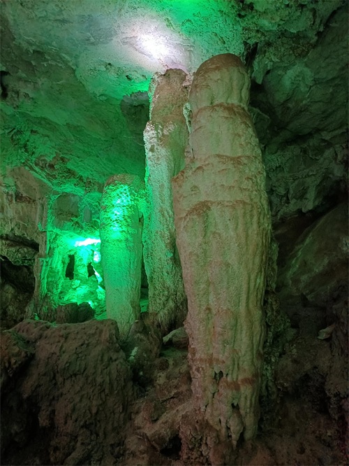 该洞主要景观就是一片倒挂的钟乳石——地下倒石林景观。蝙蝠洞的特点是钟乳石倒悬垂挂,如同石林倒长一般,这些钟乳石还有一个与众不同的特点,就是石林倾斜幅度大,不规则。