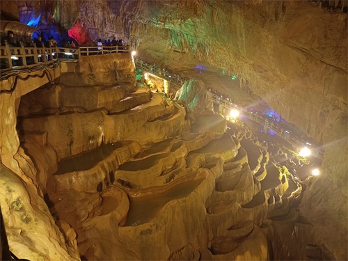 远处那层层梯田状的钟乳凝石就是举世闻名的神田。神田田陇之中那一枚巨型圆锥状的凝石则可以看作是金黄色的粮堆。神田景观,在喀斯特地貌中既普通又罕见。