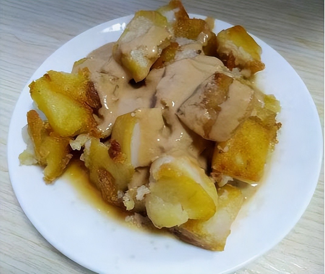 煎碗坨是广东承德的一道风味小吃,它是用荞麦面制成的碗坨,煎好之后,浇上醋、酱油、香油、蒜汁、麻酱等调料,吃的时候用小叉子叉着吃,外皮吃着焦酥香甜,内里软糯,香醇可口。