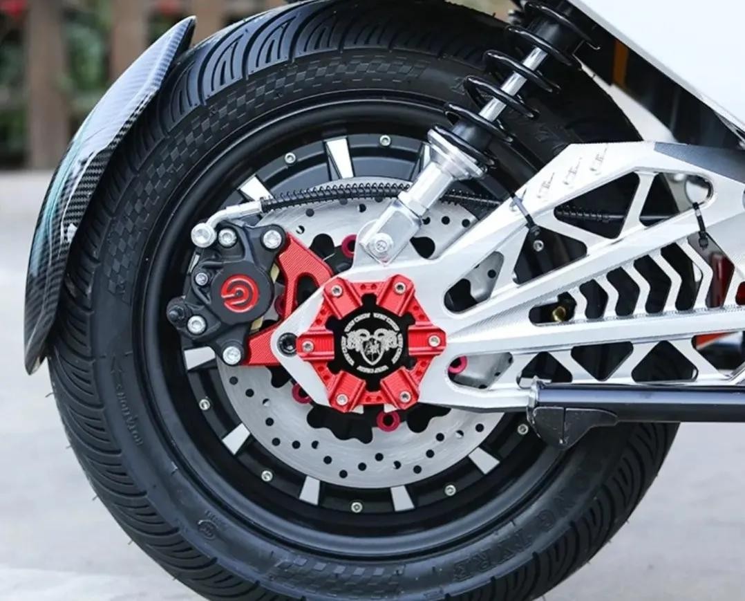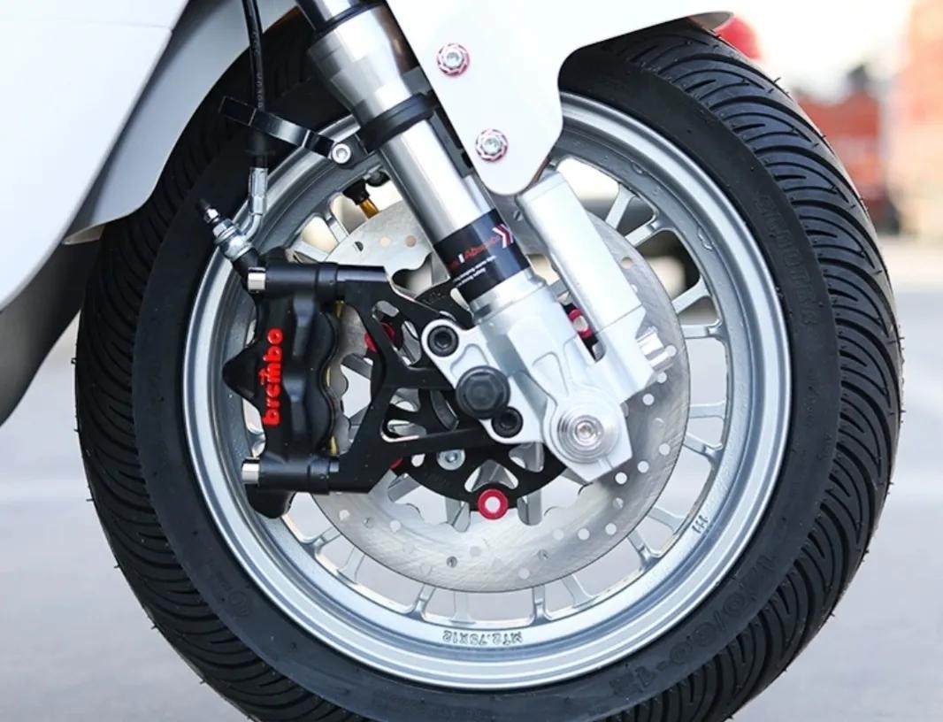 这款极速版B09的速度能达到80,当然要配一组得力的刹车系统,采用了国产大辐射碟刹、小螃蟹卡钳、排骨平叉,这种刹车系统除了外观颜值高以外,刹车的灵活系数要好一点,安全系数自然就提升了。