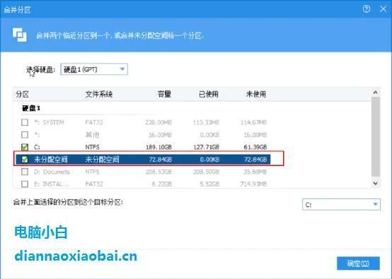 步骤4. 右键单击C盘,然后选择“合并分区”。勾选C盘和未分配的空间,然后单击“确定”。