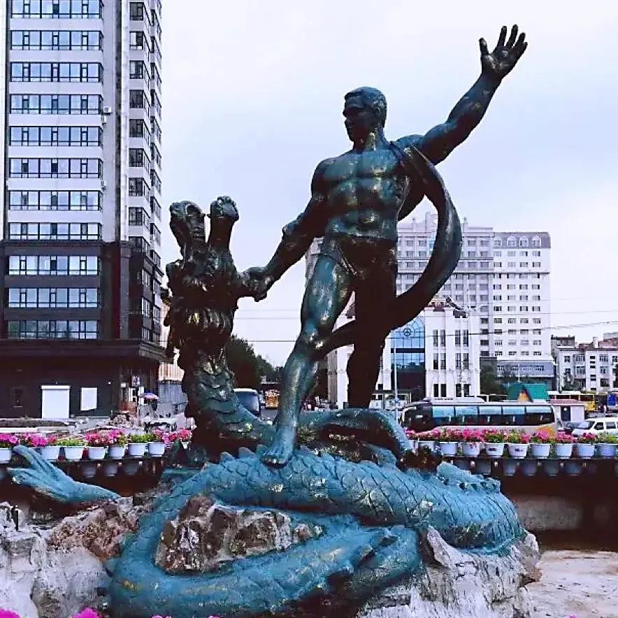 在通江街公园入口的地方,坐落着一个降龙雕塑,是57年抗洪胜利之后建成的。是一个巨人牢牢的扼住了龙的脖子,让它不能再随意喷水。