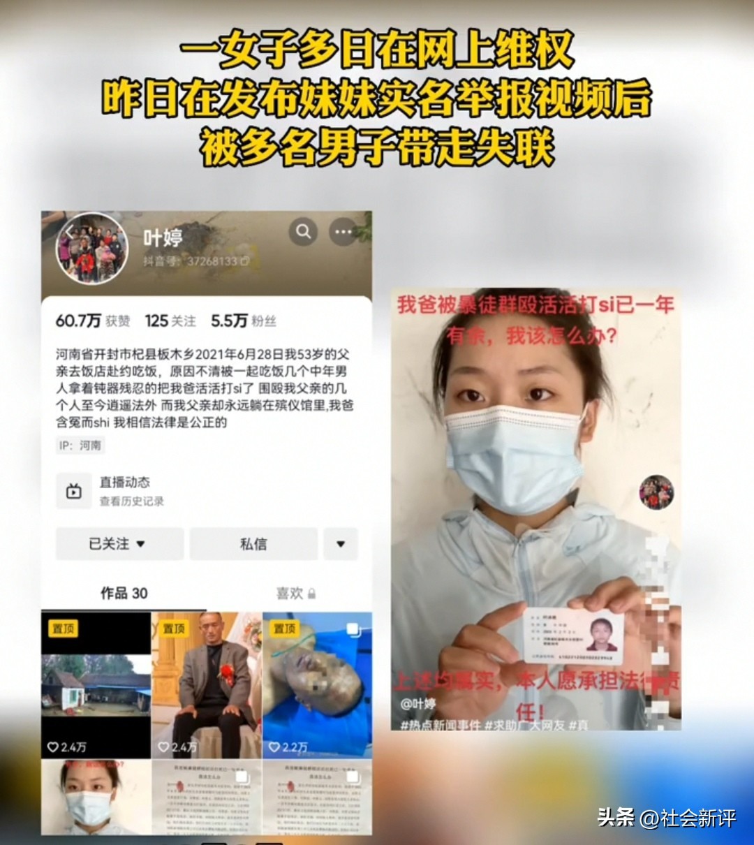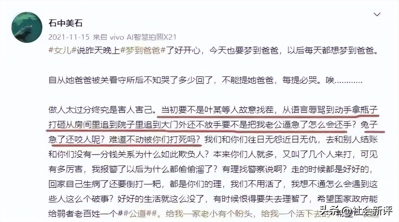 三、叶婷实名举报“父亲被打死,嫌疑人至今逍遥法外”
