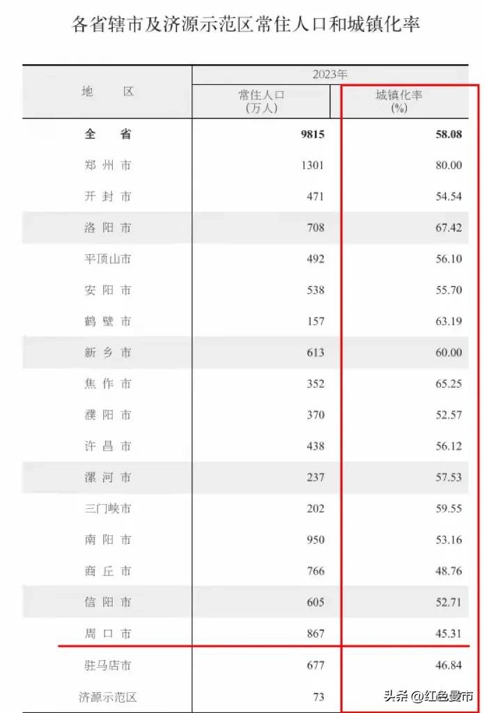 在河南,周口市867万的常住人口数量虽然仅次于郑州、南阳高居全省第三,但城镇化率却只有45.31%,不仅是全省最低,甚至还低于河南省平均水平12.77个百分点。