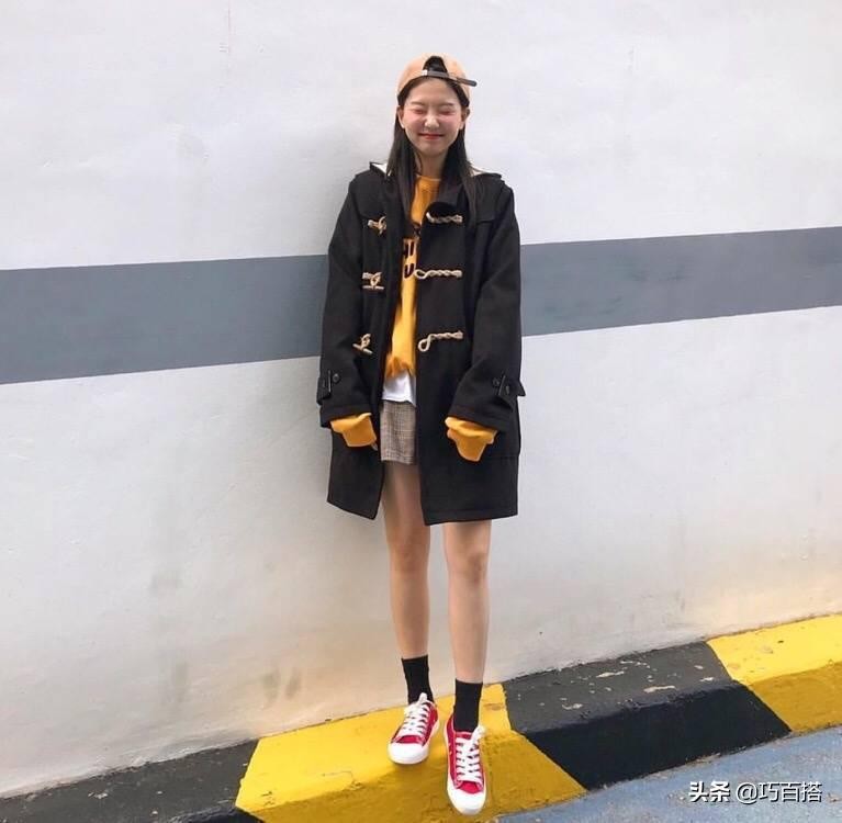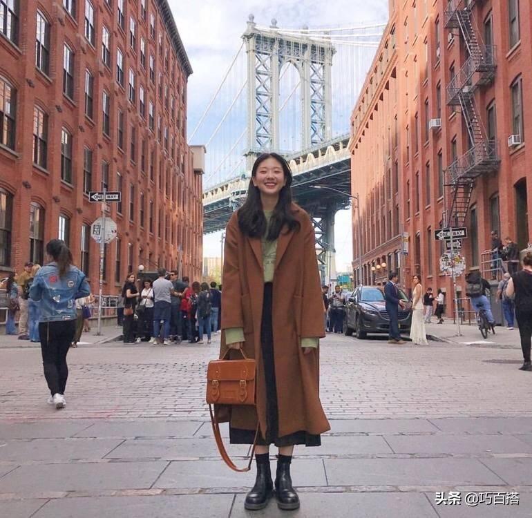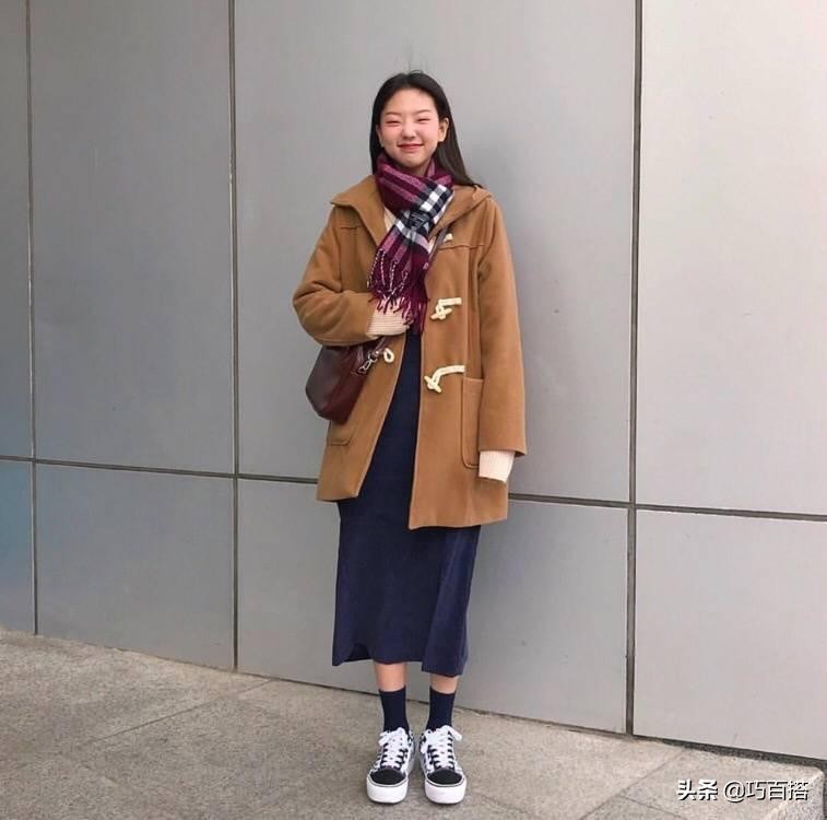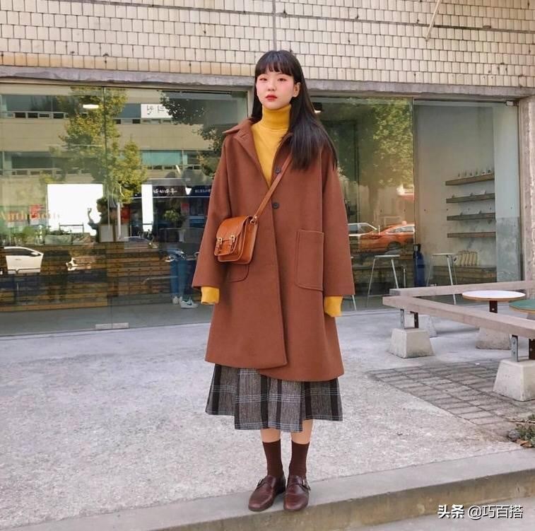 在韩剧中大家肯定看过这样的场景:女主角的上身特别厚实,但是下身只需要搭配一条好看的半裙。这几年这样的风格也渐渐流行进了国内,尤其是在搭配一些长款大衣的时候,一条好看的半裙能够显得搭配很有层次感。复古的棕色斗篷大衣搭配英伦格子半裙有一种日系的感觉,小皮鞋显嫩减龄,再加一个可爱复古的包包,大街上最嫩的学生党就是你!