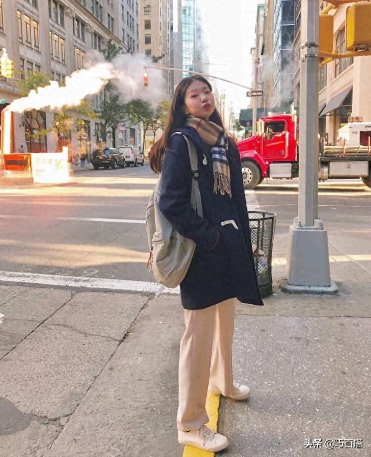 首先就是大家都会选择的一种方式,也就是大衣搭配休闲裤。不仅舒适还好穿,上身是藏蓝色的牛角扣大衣娇憨可爱,下身选择了米白色的休闲裤很有街拍感,宽松的裤腿显得腿很细而且直,一双随处可见的小白鞋帮助你分分钟穿出少女校园感。