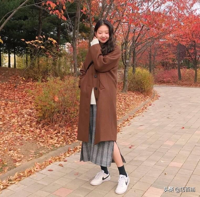 如果觉得半裙长度过长太过保守,可以选择开叉设计的半裙,既不会挡住自己的腿部曲线,也能穿出层次感,不过一定要记得搭配光腿神器,不能要风度不要温度哦。不知道大家发现没有,一般棕色的大衣我们都会选择格子裙或者偏英伦复古风格的半裙相呼应,有一种经典感,搭配小白鞋简单大方,也不会像高跟鞋那样把整个人的气质拉的过于成熟。