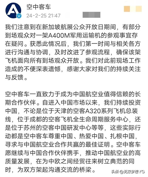 空客还表示,他们将立即采取措施,调查此事,并严肃处理相关责任人。他们承诺,将加强内部管理,确保类似事件不再发生,并向全球范围内的所有合作伙伴、消费者和员工致以诚挚的歉意。
