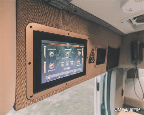 控制面板方便一键控制车内电器,此款车配有6400瓦逆变器、600瓦的太阳能、12度电池容量。顶置空调,换气天窗,USB接口,12伏和110伏插座,还有大量的LED照明灯,车内透亮无暗影。