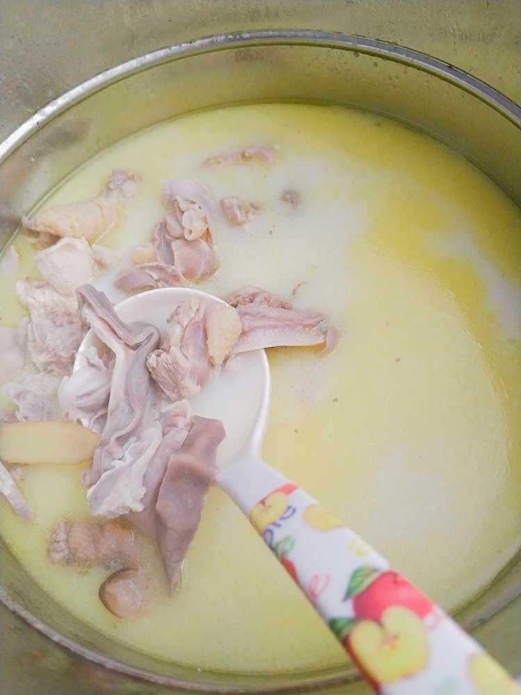 5.如果你恰好没有牛奶也懒得买,那么可以把焯水鸡肉先加点花生油跟姜,猛火炒一下,加水加胡椒碎加猪肚,猛火煮沸5分钟,再转炖锅。汤色也会比较白,不过不如牛奶那么好看。
