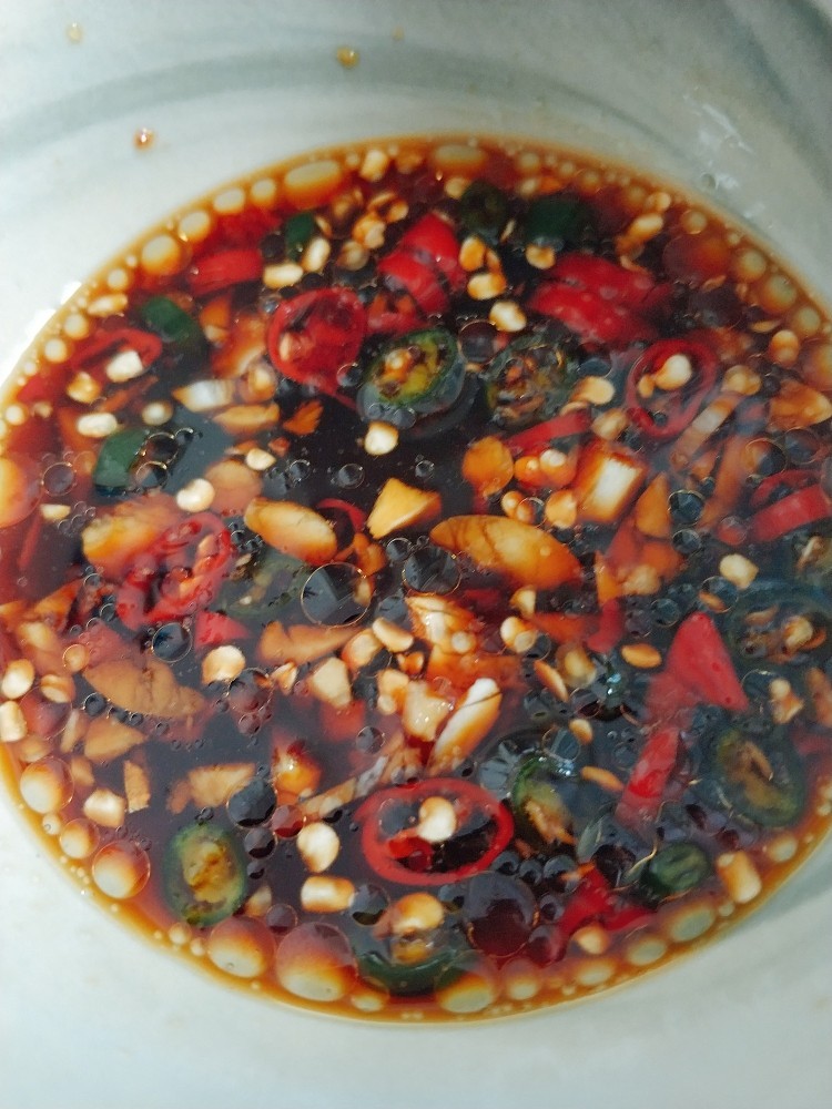 趁着炖的功夫调一个味汁,小米椒两个蒜一瓣拍一下切碎,3勺味极鲜生抽,一点鸡粉,一点糖,一点花生油或者香油。